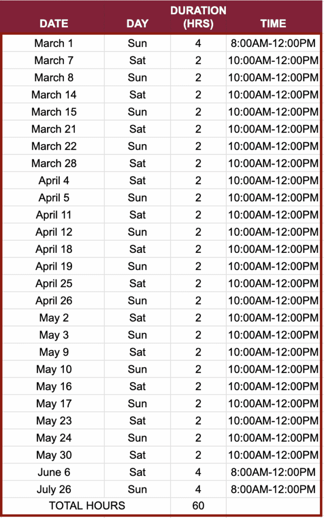Schedule D (Saturday & Sunday PM Class)