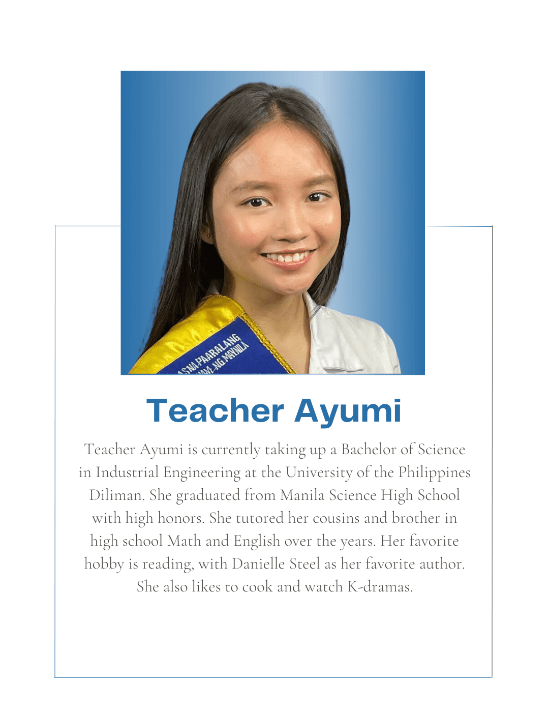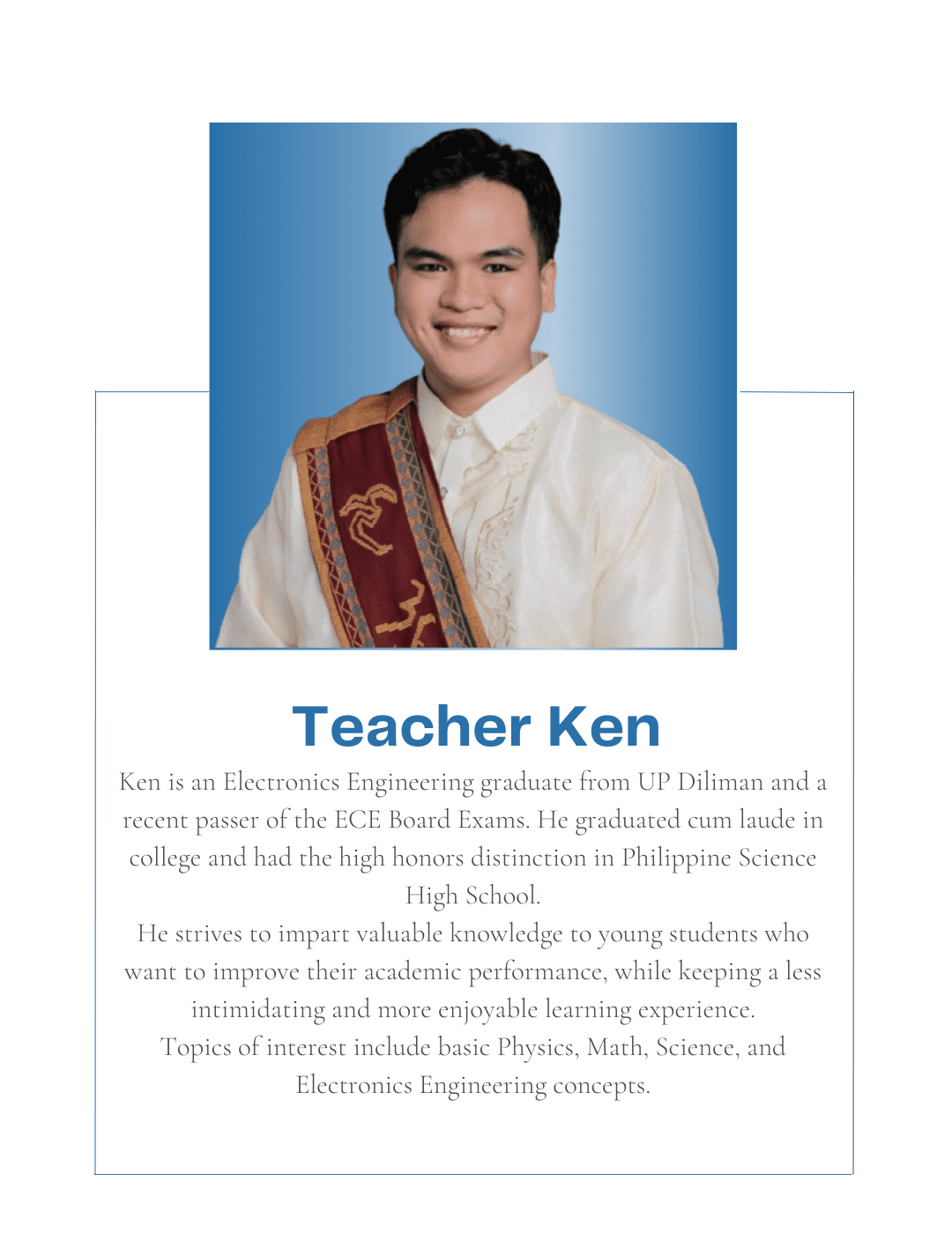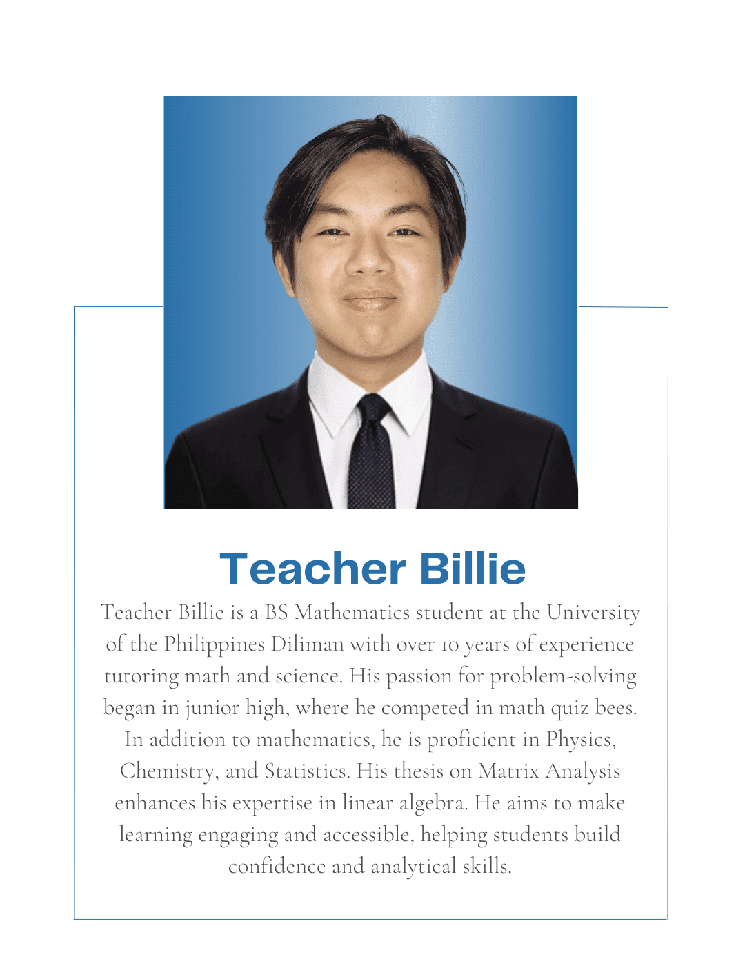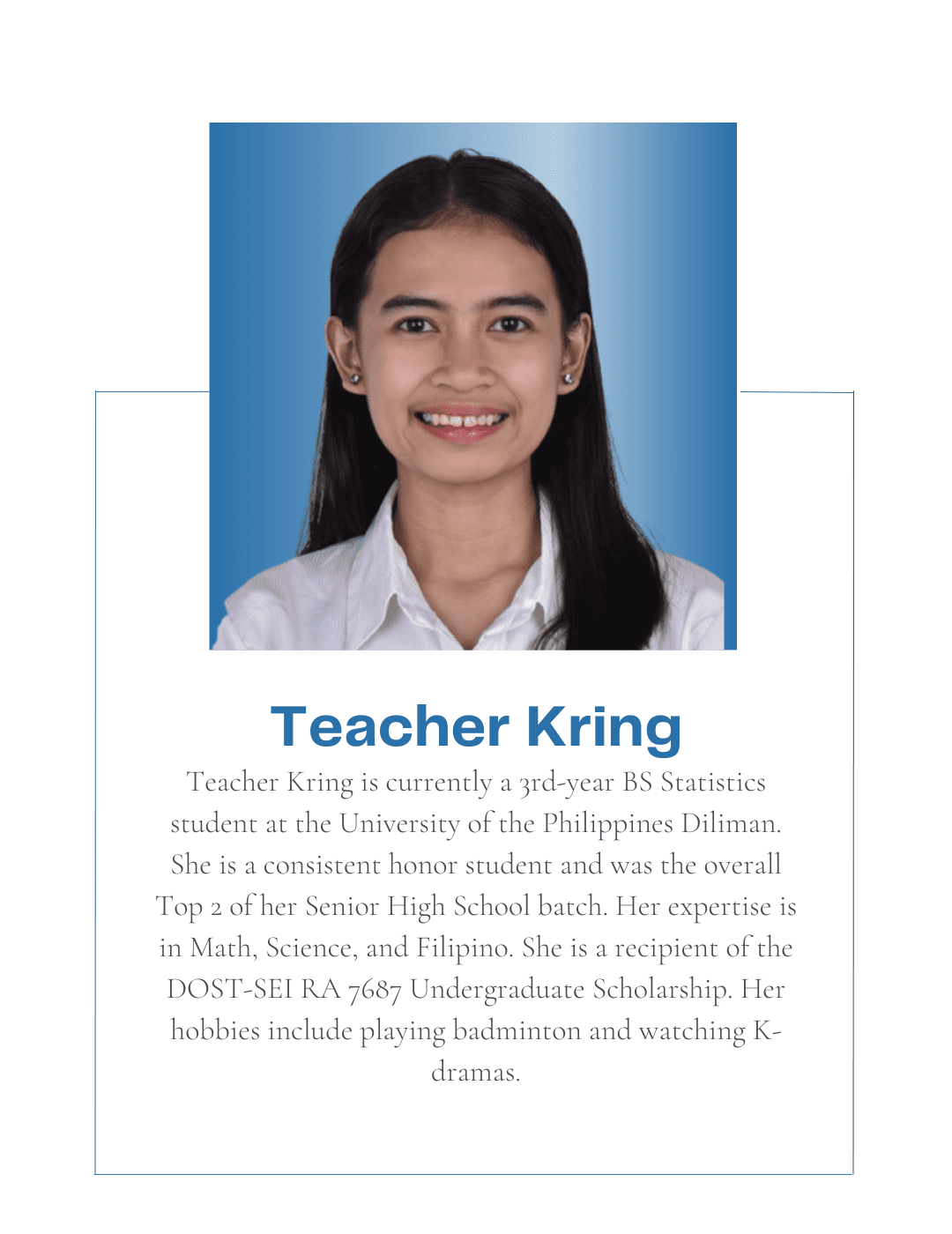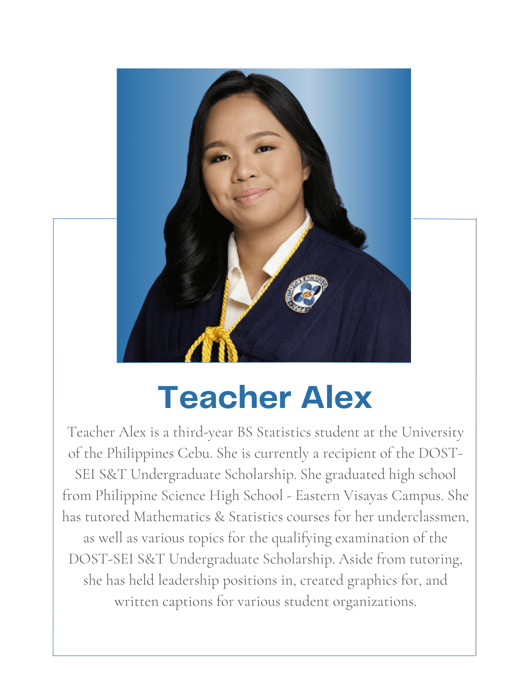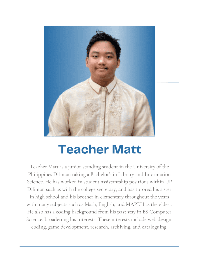 Tutorial Hub PH carefully chooses tutors with the proper educational credentials and a genuine interest in sharing their knowledge to help students build an excellent academic self-image and achieve their academic goals. All are studying or graduated from UP, with some currently taking their masters or PhD at the university.